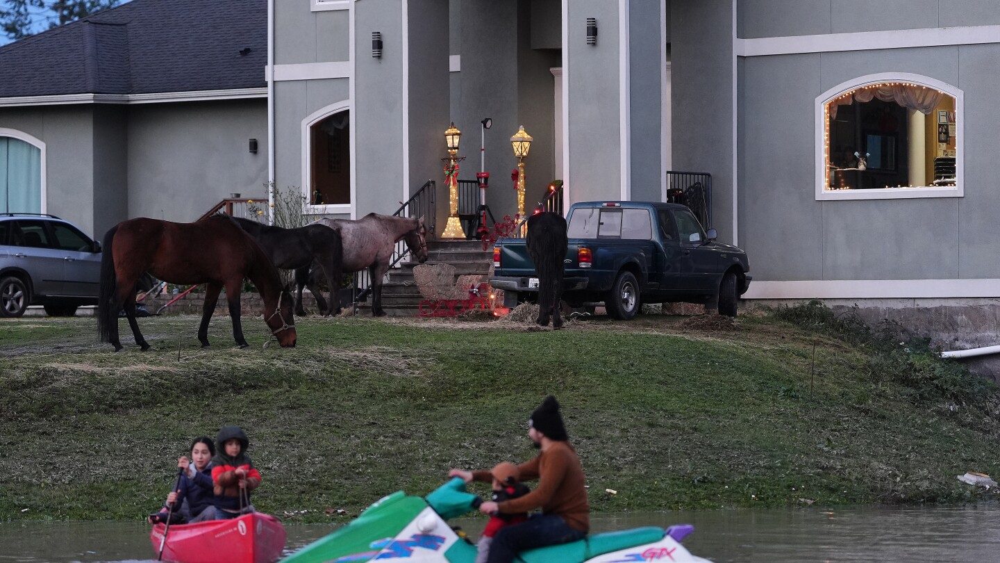 “E-man” Trujillo uses a jet-ski to pull his children in a canoe as the family’s horses graze on high ground in near their front door after heavy rains led to historic flooding in the region Saturday, Dec. 13, 2025, in Burlington, Wash. (AP Photo/Lindsey Wasson)