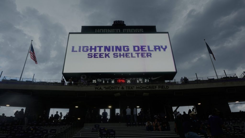 TCU had just taken a 35-21 lead on Trent Battle’s 65-yard touchdown run with 13:46 left when play was stopped the first time because of lightning detected in the vicinity of the stadium.