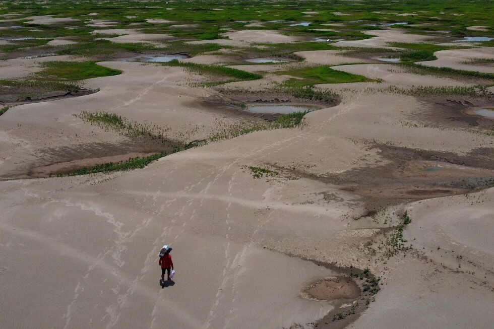 Students carrying umbrellas stand on the dry riverbed of the Jialing Rivera, a tributary of the Yangtze, in southwestern China’s Chongqing Municipality, Aug. 19, 2022. (AP Photo/Mark Schiefelbein, File)