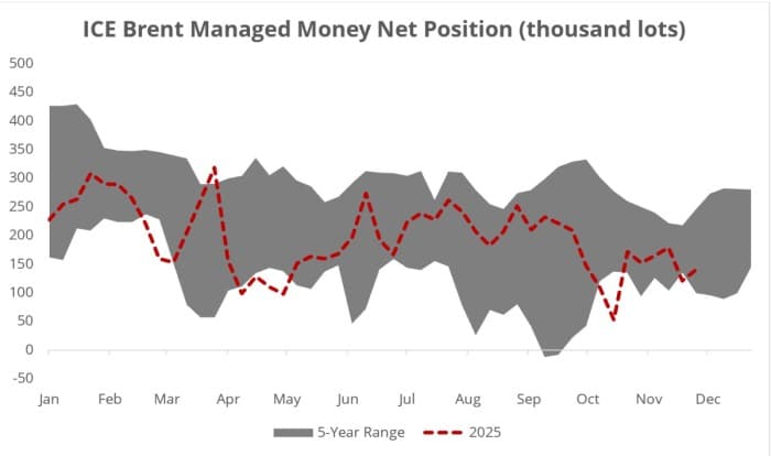 – Hedge funds have been raising their short positions on crude for the past two months, with ICE Brent now posting the highest outright number of shorts on record (174,703 contracts in the week ending December 2).