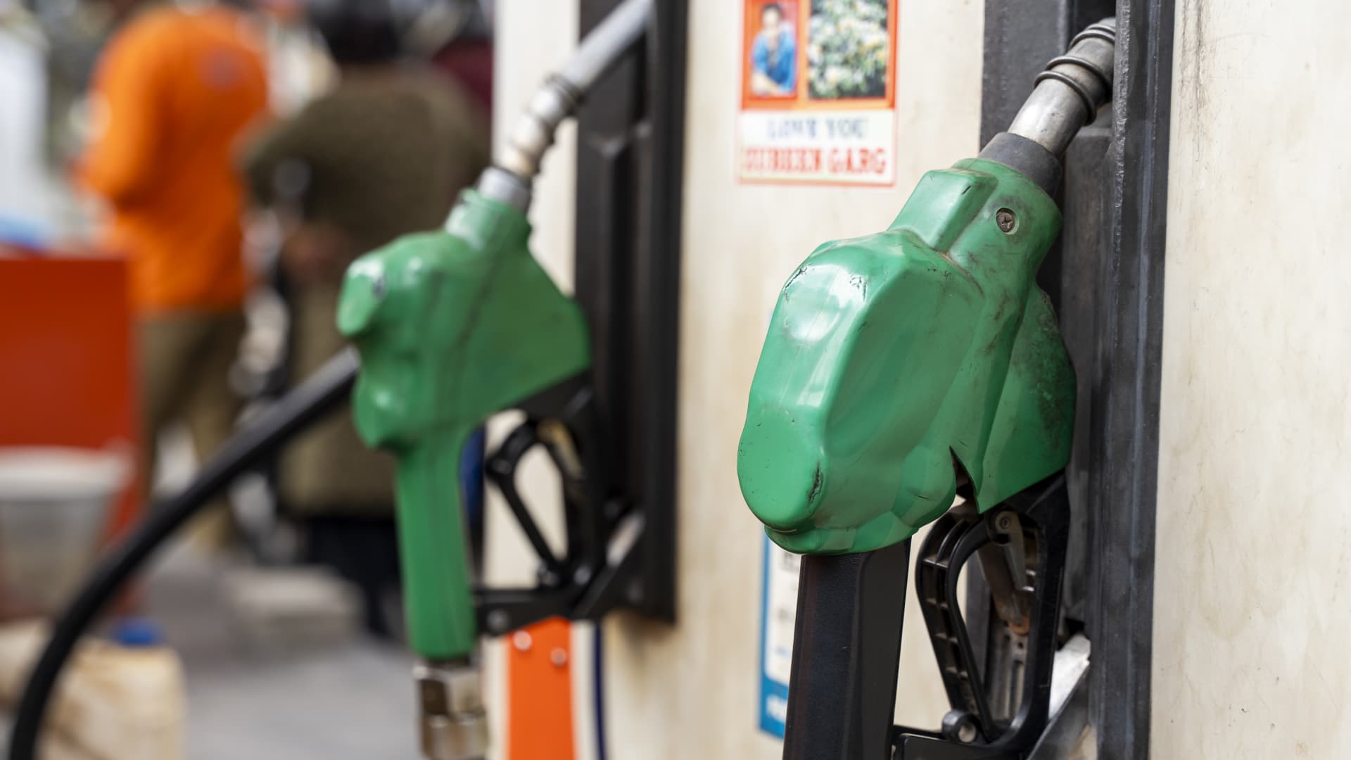 Fuel nozzles hang at a petrol pump at a fuel station in Guwahati, India, on March 11, 2026. Oil prices reverse course from recent highs, slipping to around 90 USD a barrel after remarks by U.S. President Donald Trump on the Iran conflict. Markets remain unsettled as traders monitor the evolving geopolitical situation. (Photo by David Talukdar/NurPhoto via Getty Images)