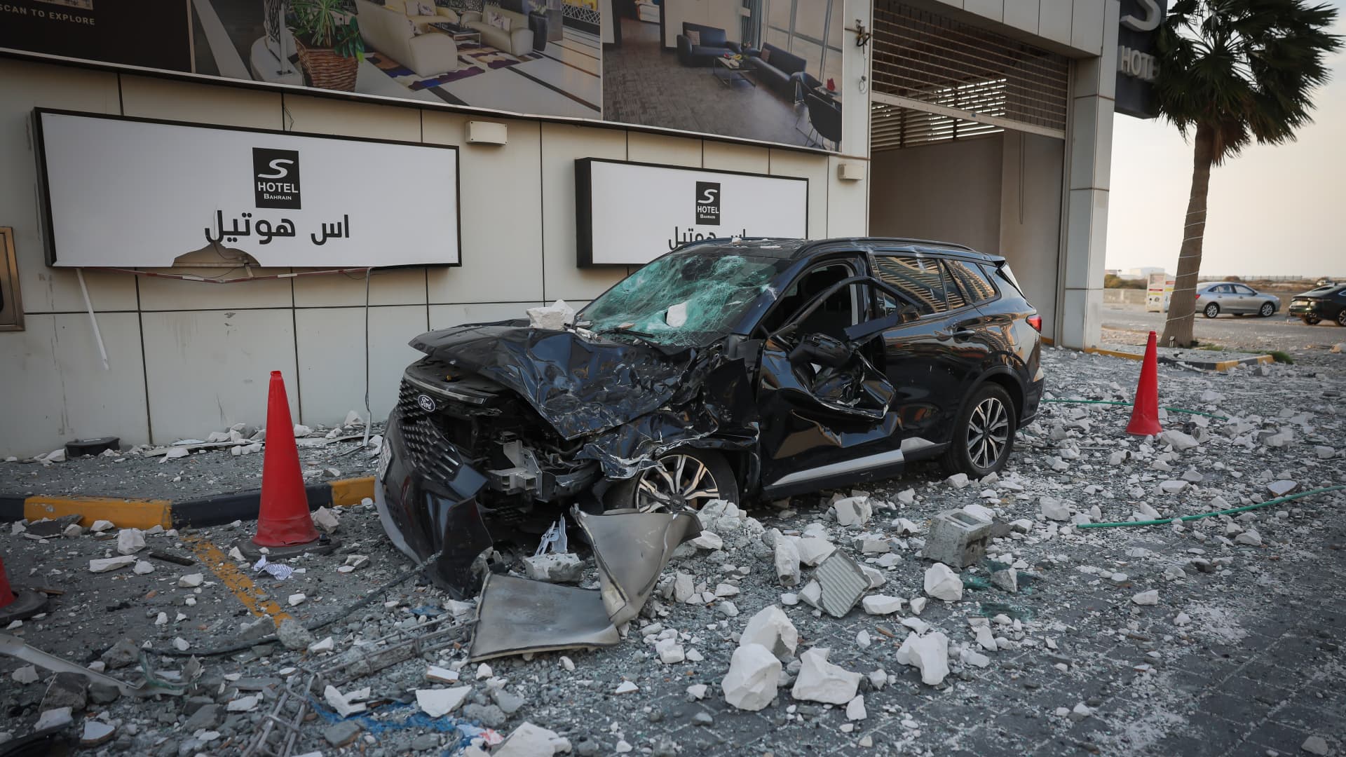 A view of damage after an Iranian drone struck several buildings in Manama, Bahrain on March 1, 2026.
