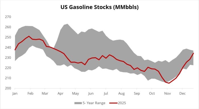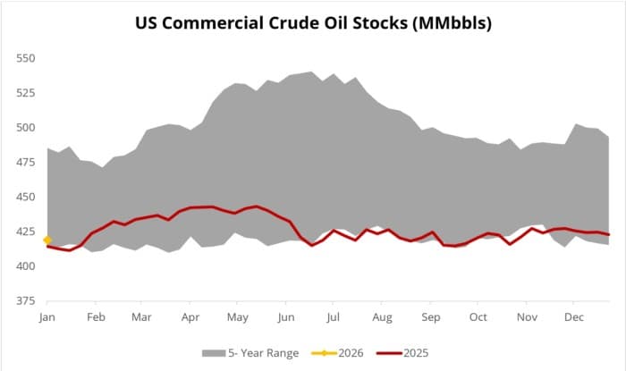 Iran protests have added some impetus to 2026’s heretofore surprisingly bullish start, putting potential supply disruptions back on the agenda. Moreover, the failure of the Trump government to entice US oil majors to invest in Venezuela and Treasury Secretary Bessent’s call for ‘wildcatters’ to drill there soothed some concerns that Venezuela’s oil production could soar in the near term. As such, ICE Brent is set to end this week with a $2 per barrel gain at almost $63 per barrel, the third weekly gain in a row.