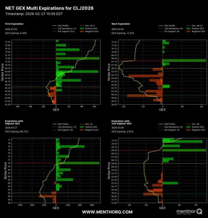 What you will want to keep a close attention to is also how the GEX profile changes. As the GEX profile changes, you are going to see which price levels become more important as participants move their strikes and market makers hedge across the curve. This was the NetGex for CL as of Friday.
