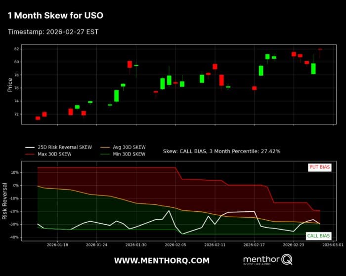 Traders buy out-of-the-money calls as insurance against a spike. This lift call implied volatility relative to puts, creating positive call skew. However, skew can invert depending on the macro backdrop. If the conflict threatens global growth or triggers financial contagion, demand destruction becomes the dominant fear. In that case, out-of-the-money puts become more expensive as traders hedge against downside collapse. Put skew steepens.