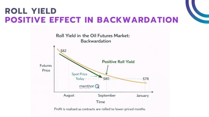 The curve shape has direct implications for storage and roll yields. In strong backwardation, holding physical inventory is costly because future prices are lower than spot prices. Traders are incentivized to release barrels into the market rather than store them. Storage tanks are empty. Roll yields are positive for long futures positions because, as contracts approach expiry, they converge downward toward a lower deferred price.