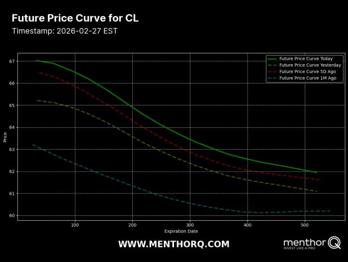In war environments, skew can shift rapidly as narratives change. A single headline can rotate the dominant risk from supply shock to demand shock within hours. Watching skew dynamics is often more informative than watching the outright price.