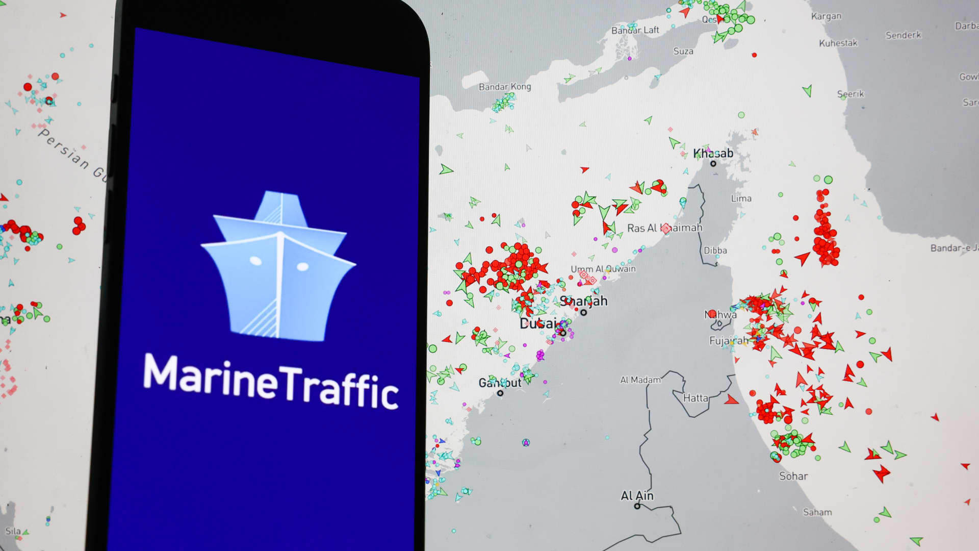 MarineTraffic map showing current ships traffic on Strait of Hormuz dislplayed on a laptop screen and MarineTraffic logo displayed on a phone screen are seen in this illustration photo taken in Krakow, Poland on March 5, 2026.