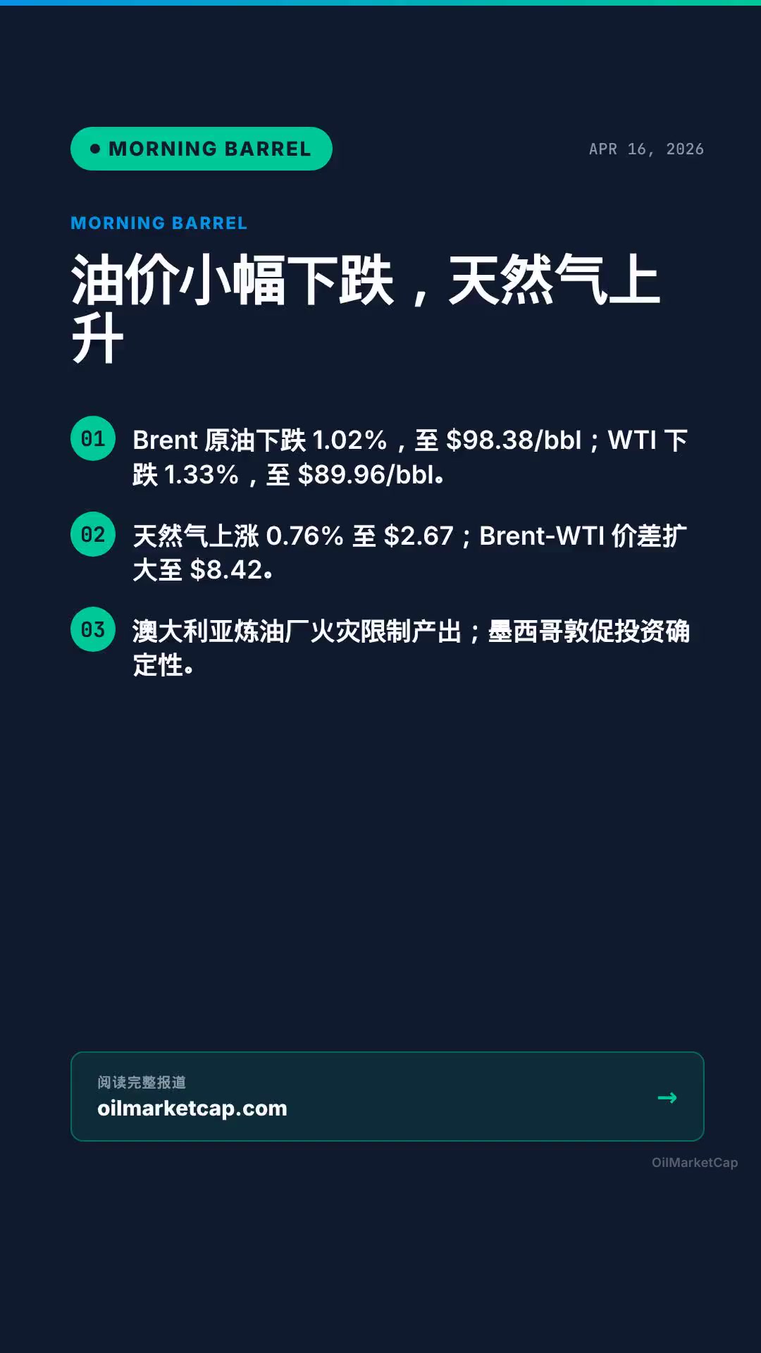 Daily oil market video briefing. Brent, WTI, Natural Gas, and the news driving the tape. Published every morning in English, Mandarin, Arabic, and Spanish. Open to everyone.