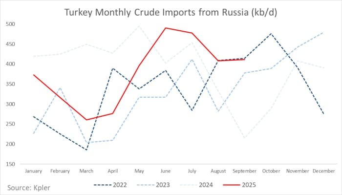 Midway through autumn 2025, Russian crude oil continues to dominate Turkey’s refinery feedstock, defying both geopolitical pressure and the Trump administration’s assertive diplomacy. September import data show Russian volumes flowing to Turkey above monthly averages at 410,000 b/d, extending a pattern that began in early summer and shows little sign of reversing.