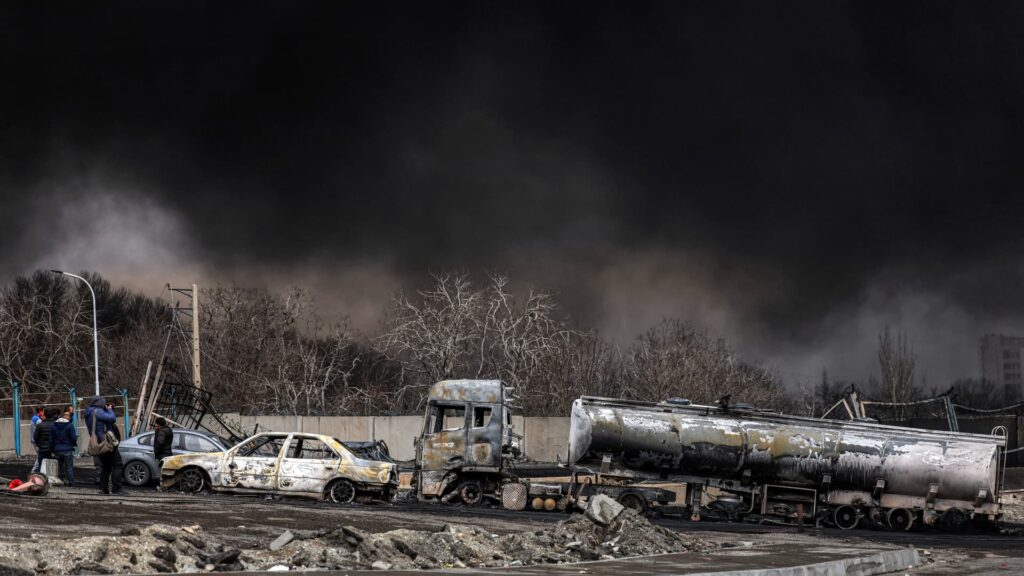 A dark smoke cloud engulfs destroyed vehicles near an ongoing fire following an overnight airstrike on the Shahran oil refinery in northwestern Tehran on March 8, 2026.