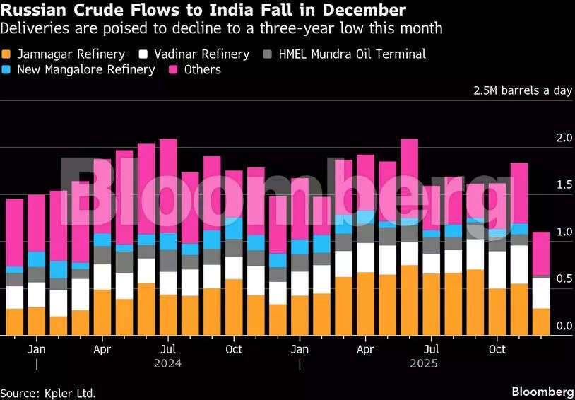 The decline in December imports follows the pause by Reliance — previously the biggest buyer — while Kpler figures show lower flows to the HPCL-Mittal Energy Ltd. Mundra oil terminal, and Mangalore Refinery and Petrochemicals Ltd. taking no barrels this month for the first time since September 2022.