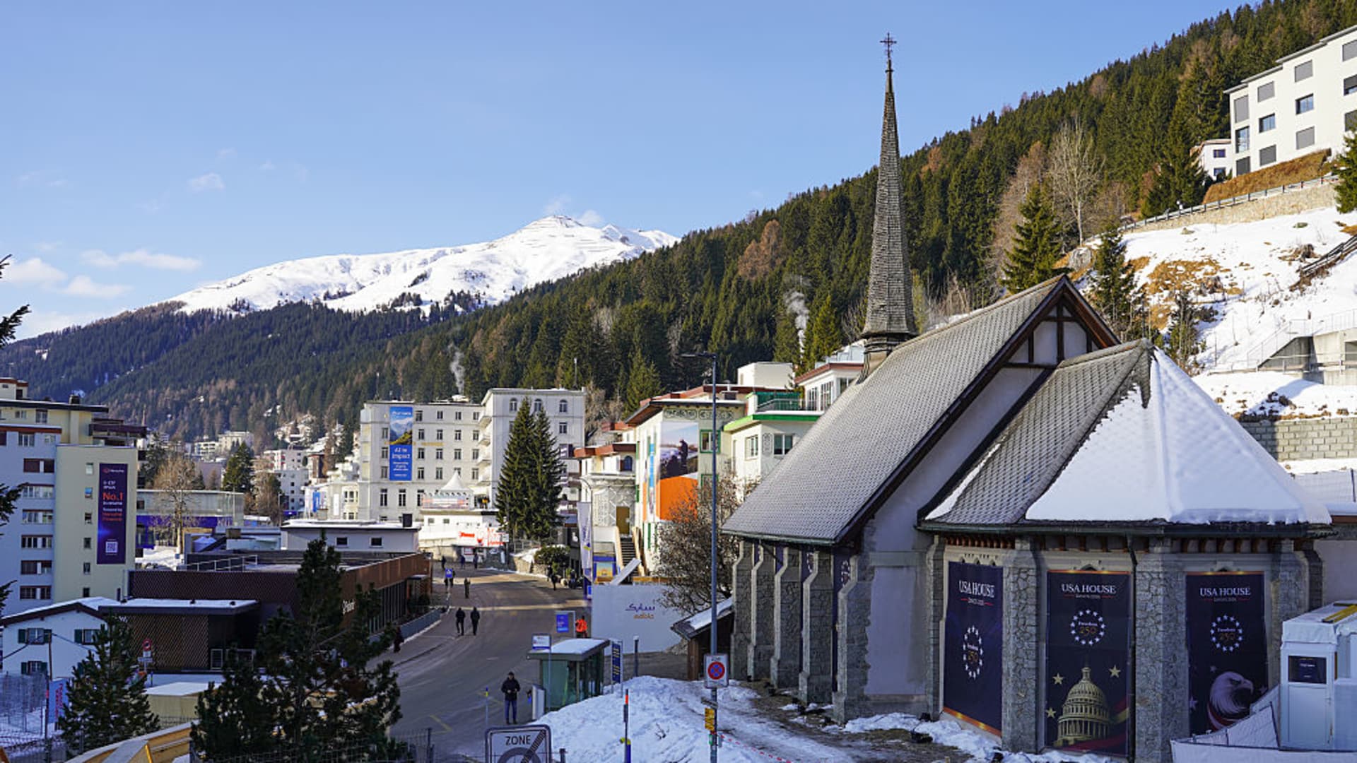 Thia photograph shows a sign displayed by the World Economic Forum (WEF) on the eve of the WEF annual meeting in Davos on January 18, 2026.