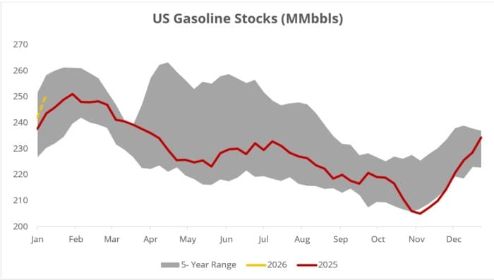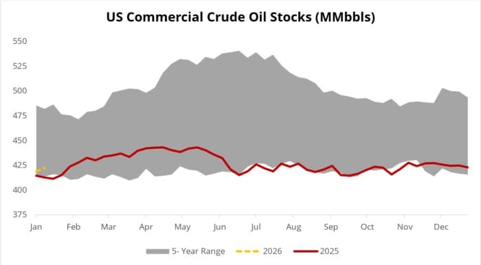 Low Prices Ratchet Up Chinese Buying. China’s General Administration of Customs reported that December crude oil imports jumped 17% year-on-year to 55.97 million tonnes or 13.18 million b/d, a new all-time high reading as higher Russian inflows compensated for lower Iranian imports.