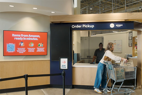 The 10,000-square-foot “store within a store” includes an automated micro-fulfillment center that holds more than 12,000 products. Shoppers can grab what they need off the shelves and also use QR codes throughout the store to order additional Amazon items, like Tide detergent or Nestlé Drumsticks, for pickup before they leave.
