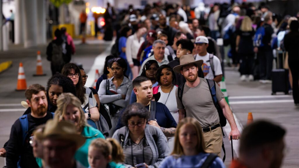 Travelers wait in line at a Transportation Security Administration (TSA) checkpoint at William P. Hobby Airport in Houston, Texas, US, on Monday, March 9, 2026.