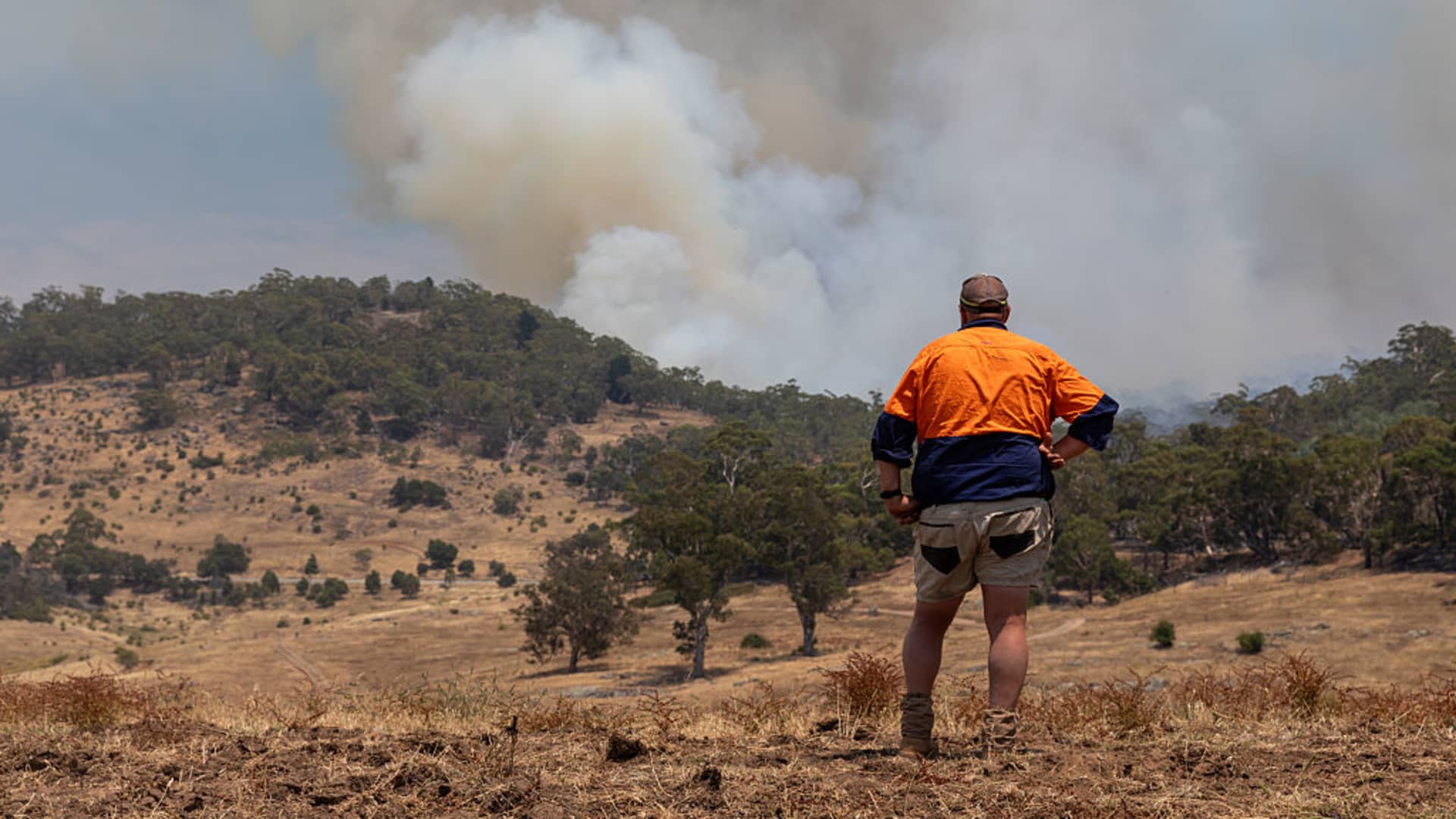 A local resident watches on as the remaining area of the Harcourt fire burns in the background on January 12, 2026 near Harcourt, Australia.